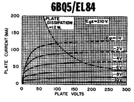 Si vous avez 300 volts à l’anode vous réglez le bias (= la polarisation) à presque – 9 volts pour avoir un courant de moins de 40 mA car si vous mettez plus vous dépassez la puissance de EL84 qui va s’user prématurément (ne jamais dépasser la ligne pointillée Wa12W [= watts anodique 12W] qui indique la puissance dissipée maximale).