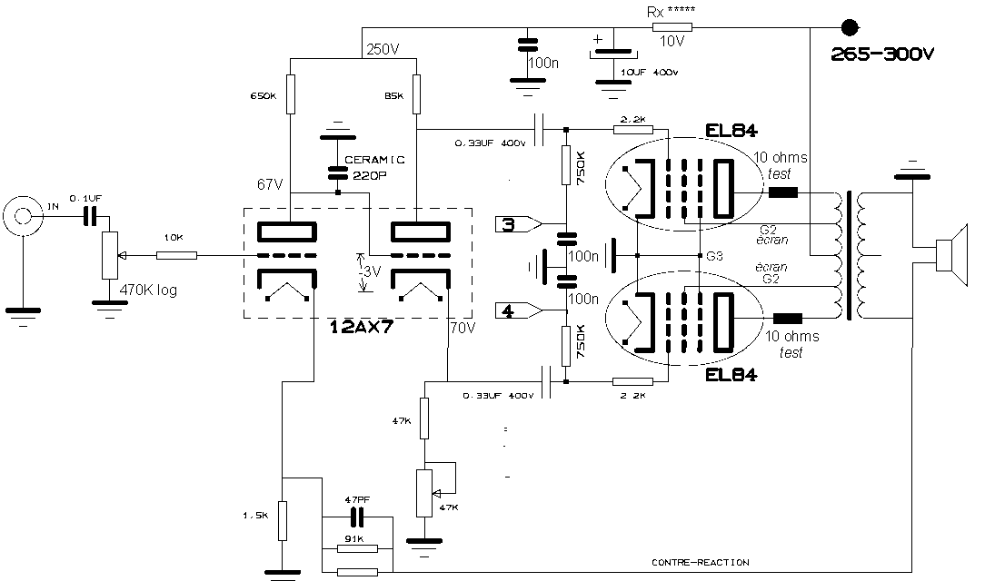 Grosso modo la haute tension nécessaire va de 250 à 320 volts. Avec des transfos de sortie à prise intermédiaire une tension de 260-275 volts suffit.